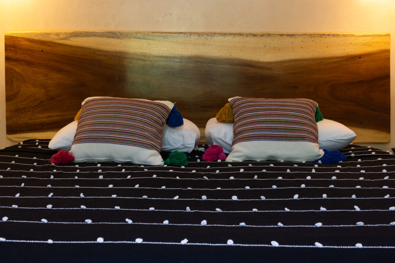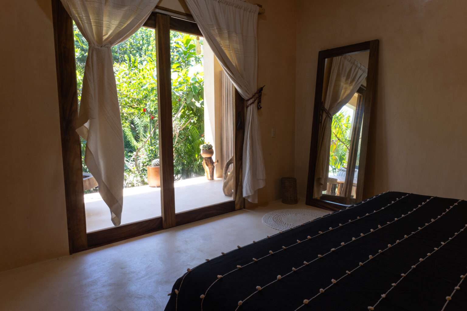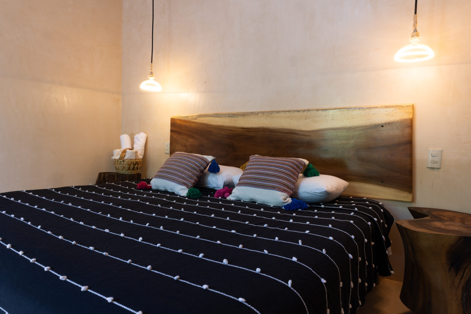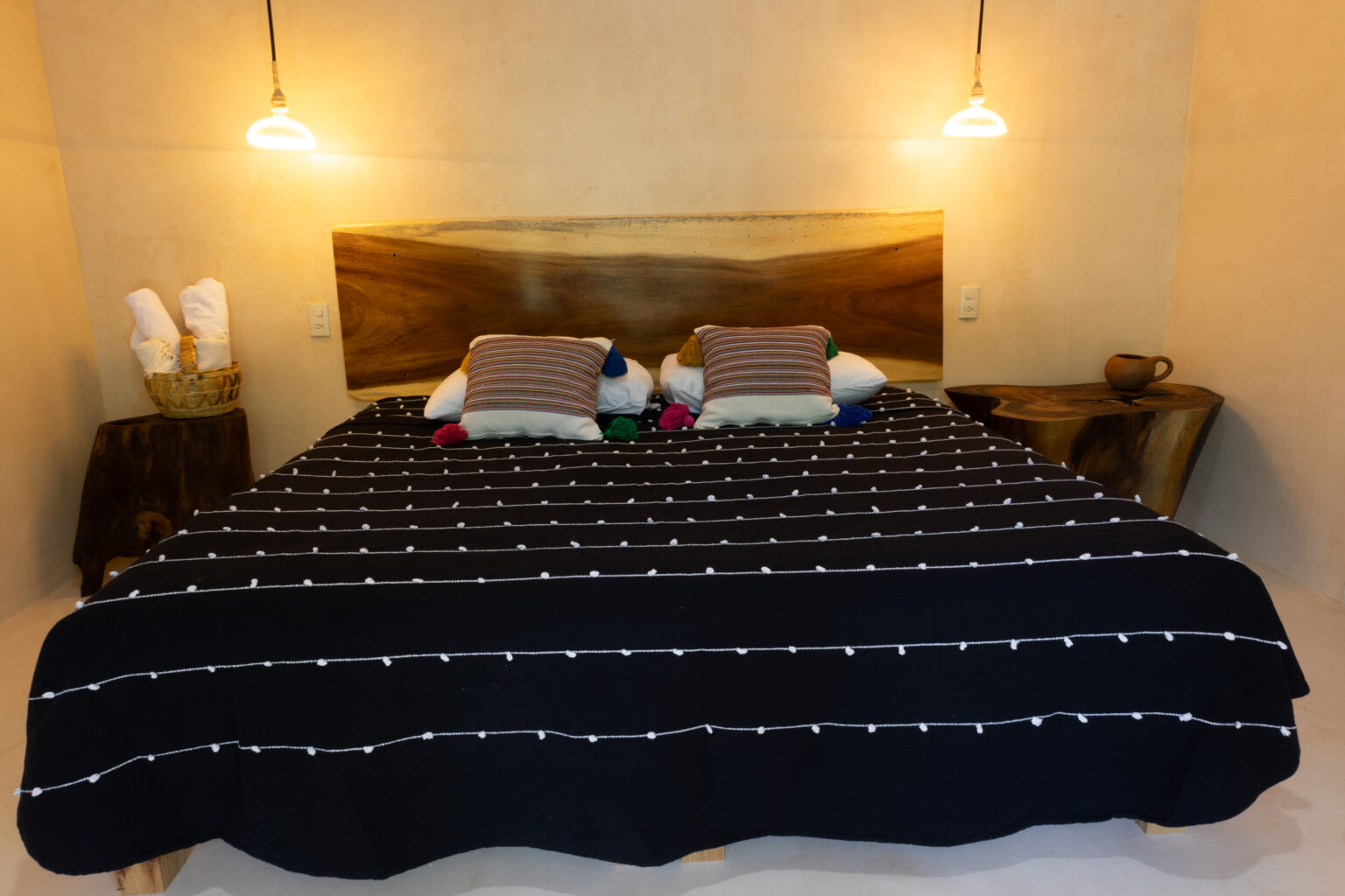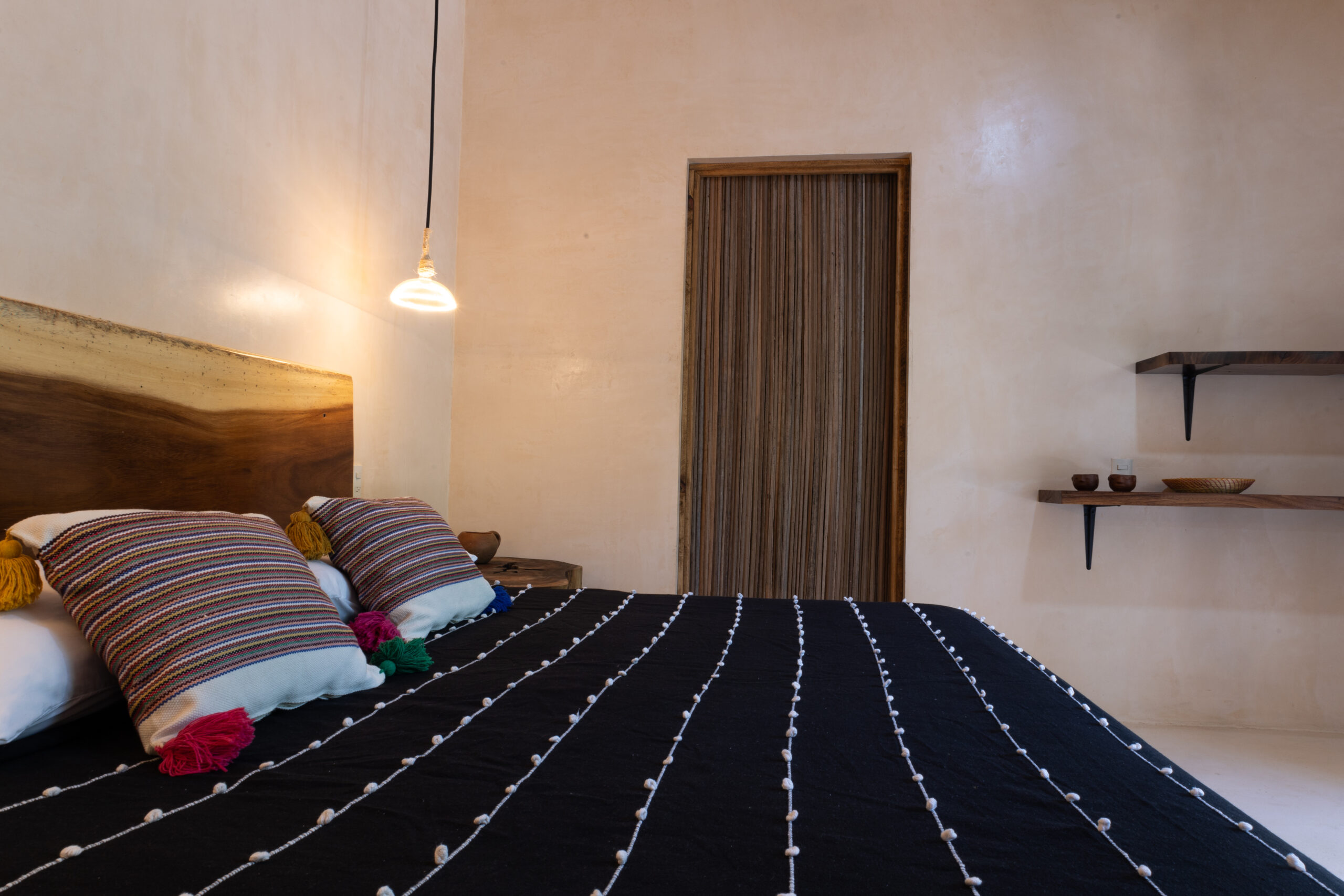 Esta habitación ofrece elegancia sencilla, en medio de un entorno tranquilo rodeado por naturaleza. Cuenta con una cama king size y junto a la decoración oaxaqueña, invitan a una perfecta escapada romántica
