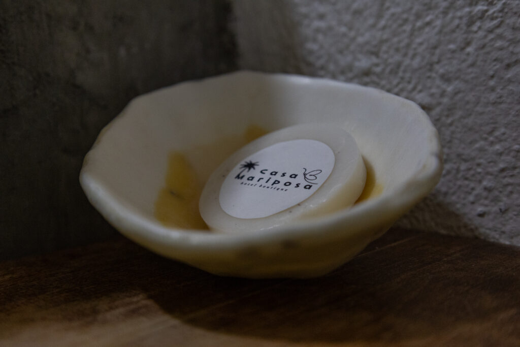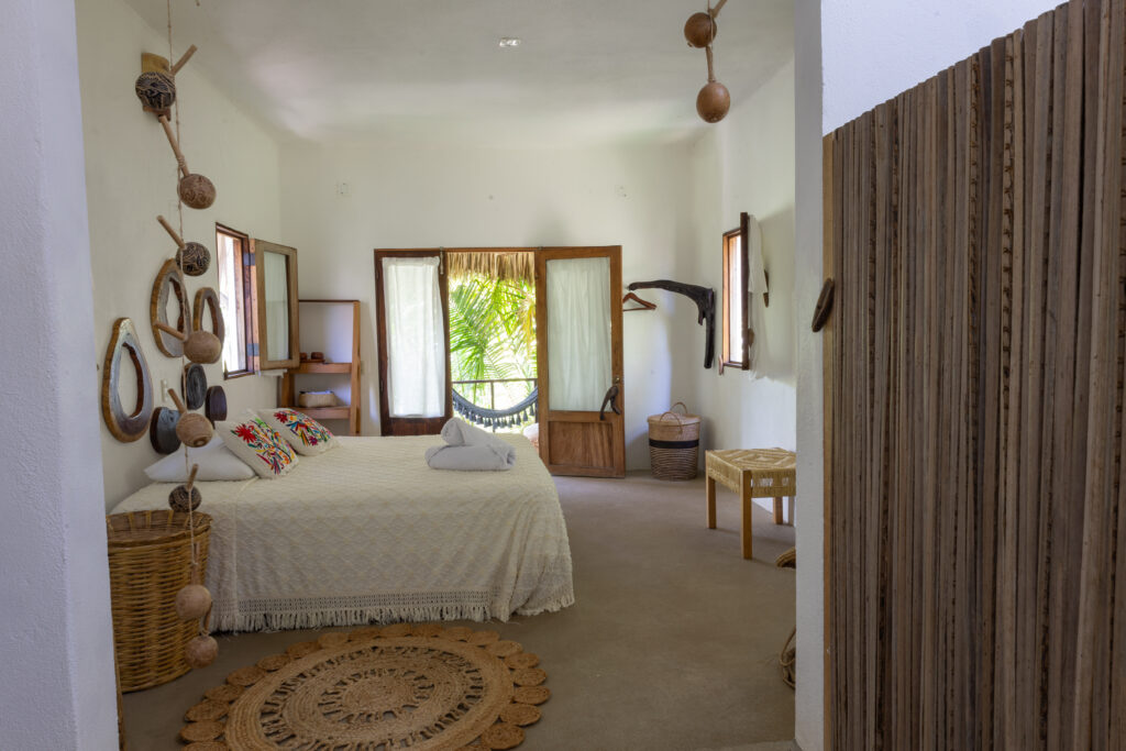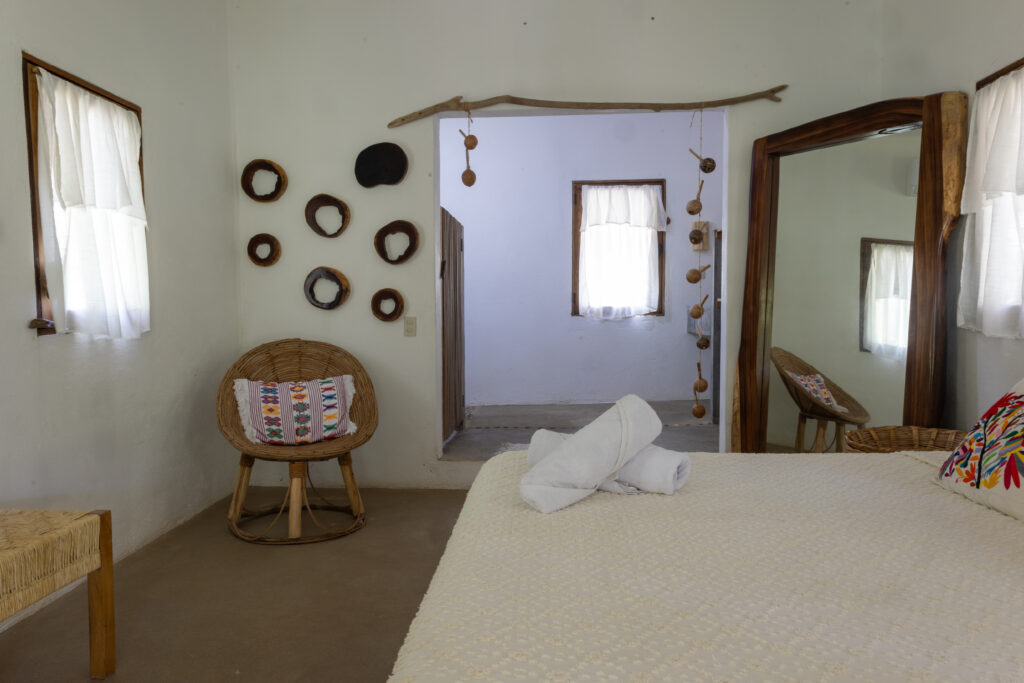 El alto techo le da un estilo dramático y acogedor, el baño de piedra de río tiene como centro un espejo de madera de parota. A la entrada los huéspedes cuenta con una estancia privada para disfruta de la brisa del mar y un atardecer espectacular